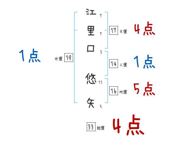 外運![]() | 江里口悠矢さんの外運は19画の1つ星!優れた才能を持ちますが、協調性が足りないことも。周りの人と協力する事を意識しましょう。 生活面を象徴する運勢です。外部から受ける影響力を表し、結婚運、家庭運や職場、環境への順応性を表します。 |