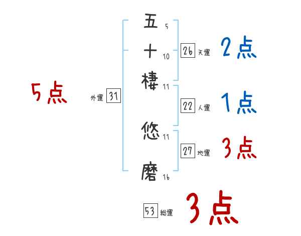 五十棲悠磨さんの画数の鑑定結果