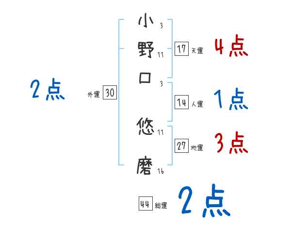 総運![]() | 小野口悠磨さんの総運は44画の2つ星!誠実で慎重な性格。物事を考えすぎないように注意しましょう。 あなたの人生を表す1番重要な運勢です。生涯を通じて影響する総合運となり、主に50歳以降の晩年期に影響を及ぼします。 |