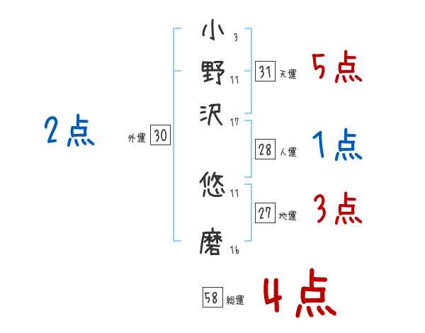 天運![]() | 小野沢悠磨さんの天運は31画の5つ星!社交性があり判断力に優れる。順風満帆な人生で円満な生活。 家系が持つ宿命的な運勢を表します。祖先から受け継いだ苗字ですので自分の力が及びません。家柄を象徴します。 |