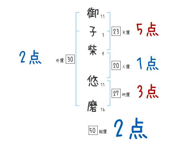 天運![]() | 御子柴悠磨さんの天運は23画の5つ星!想像力に優れ活力がある。一代で成功し名誉を手に入れる。 家系が持つ宿命的な運勢を表します。祖先から受け継いだ苗字ですので自分の力が及びません。家柄を象徴します。 |