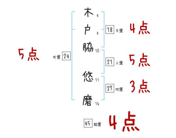 総運![]() | 木戸脇悠磨さんの総運は45画の4つ星!もくもくと物事を進め達成する。地味な努力家。 あなたの人生を表す1番重要な運勢です。生涯を通じて影響する総合運となり、主に50歳以降の晩年期に影響を及ぼします。 |