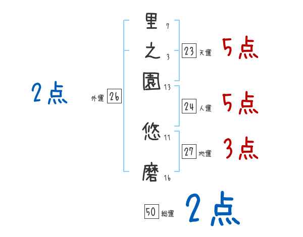 外運![]() | 里之園悠磨さんの外運は26画の2つ星!波瀾万丈かも。信頼できる人を大事にしましょう。 生活面を象徴する運勢です。外部から受ける影響力を表し、結婚運、家庭運や職場、環境への順応性を表します。 |