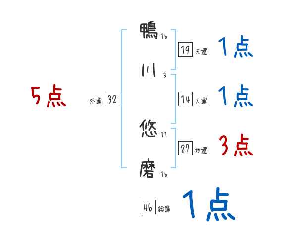 外運![]() | 鴨川悠磨さんの外運は32画の5つ星!柔軟性があり成功する。チャンスが多く金運が良い。 生活面を象徴する運勢です。外部から受ける影響力を表し、結婚運、家庭運や職場、環境への順応性を表します。 |