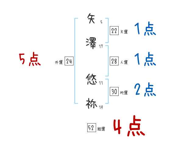 | 総運  | 矢澤悠祢さんの総運は52画の4つ星!先見性と独創性に優れ考える力がある。強運の持ち主。あなたの人生を表す1番重要な運勢です。生涯を通じて影響する総合運となり、主に50歳以降の晩年期に影響を及ぼします。 |