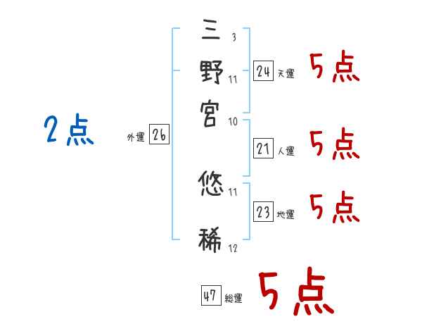 天運![]() | 三野宮悠稀さんの天運は24画の5つ星!家庭運が良く順調な人生。金運にも恵まれる。 家系が持つ宿命的な運勢を表します。祖先から受け継いだ苗字ですので自分の力が及びません。家柄を象徴します。 |