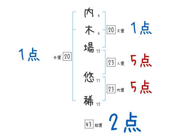 総運![]() | 内木場悠稀さんの総運は43画の2つ星!頑固な性格で独立心が強いかも。やや非現実的で浪費に注意しましょう。 あなたの人生を表す1番重要な運勢です。生涯を通じて影響する総合運となり、主に50歳以降の晩年期に影響を及ぼします。 |