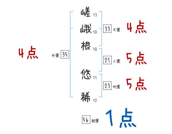 総運![]() | 嵯峨根悠稀さんの総運は56画の1つ星!消極的で無気力になりがち。誠実な気持ちが必要でしょう。 あなたの人生を表す1番重要な運勢です。生涯を通じて影響する総合運となり、主に50歳以降の晩年期に影響を及ぼします。 |