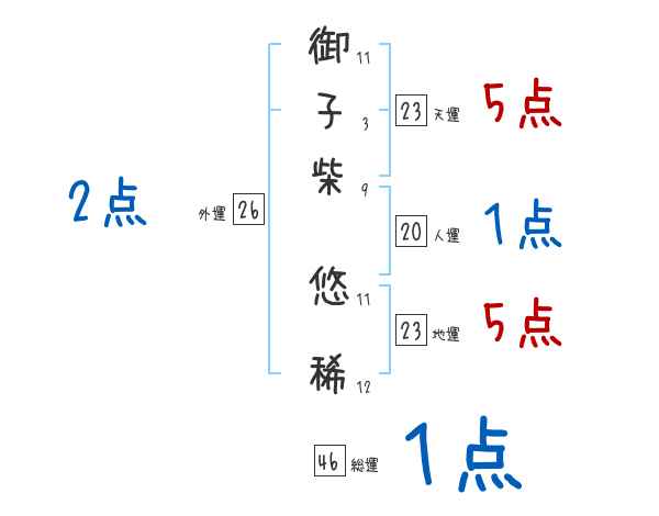 天運![]() | 御子柴悠稀さんの天運は23画の5つ星!想像力に優れ活力がある。一代で成功し名誉を手に入れる。 家系が持つ宿命的な運勢を表します。祖先から受け継いだ苗字ですので自分の力が及びません。家柄を象徴します。 |