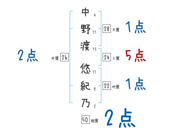 総運![]() | 中野渡悠紀乃さんの総運は50画の2つ星!浮き沈みが激しく不安定。しりすぼみに衰退しやすいので注意しましょう。 あなたの人生を表す1番重要な運勢です。生涯を通じて影響する総合運となり、主に50歳以降の晩年期に影響を及ぼします。 |
