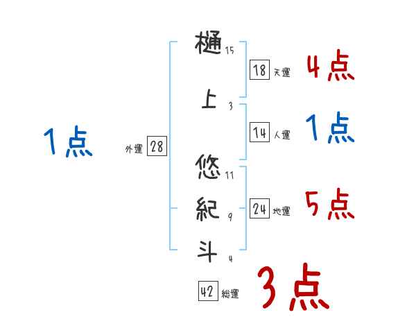 天運![]() | 樋上悠紀斗さんの天運は18画の4つ星!情熱的で剛気。忍耐力があり信頼される。 家系が持つ宿命的な運勢を表します。祖先から受け継いだ苗字ですので自分の力が及びません。家柄を象徴します。 |