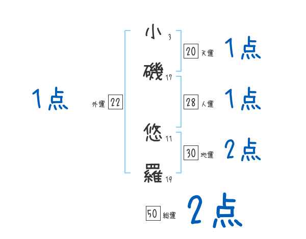 外運![]() | 小磯悠羅さんの外運は22画の1つ星!努力することが苦手ないっぽう手先が器用。芸術性にも優れる。 生活面を象徴する運勢です。外部から受ける影響力を表し、結婚運、家庭運や職場、環境への順応性を表します。 |