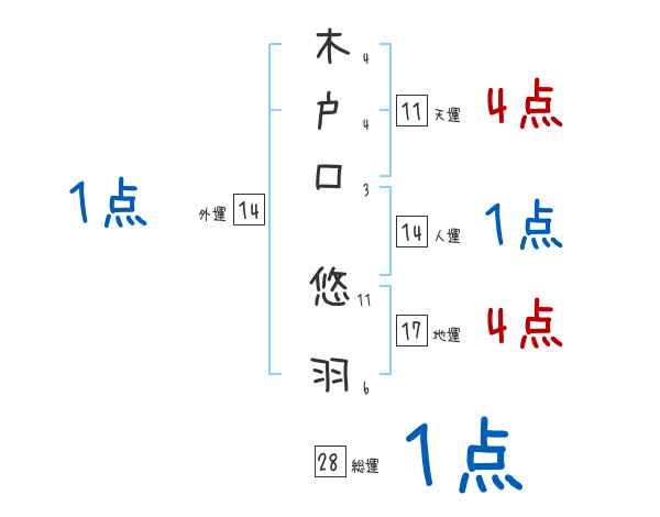 天運![]() | 木戸口悠羽さんの天運は11画の4つ星!着実に富や地位を得る幸運な人生。 家系が持つ宿命的な運勢を表します。祖先から受け継いだ苗字ですので自分の力が及びません。家柄を象徴します。 |