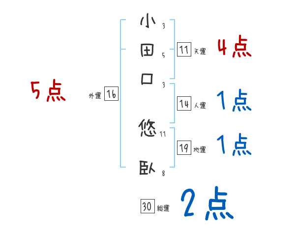 外運![]() | 小田口悠臥さんの外運は16画の5つ星!人望が厚く大きく発展する。逆転成功が見える。 生活面を象徴する運勢です。外部から受ける影響力を表し、結婚運、家庭運や職場、環境への順応性を表します。 |