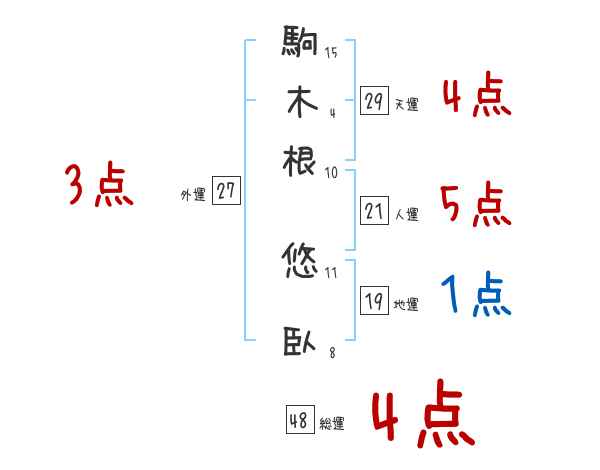 天運![]() | 駒木根悠臥さんの天運は29画の4つ星!完全主義で才能がある。厳格な心の持ち主。 家系が持つ宿命的な運勢を表します。祖先から受け継いだ苗字ですので自分の力が及びません。家柄を象徴します。 |