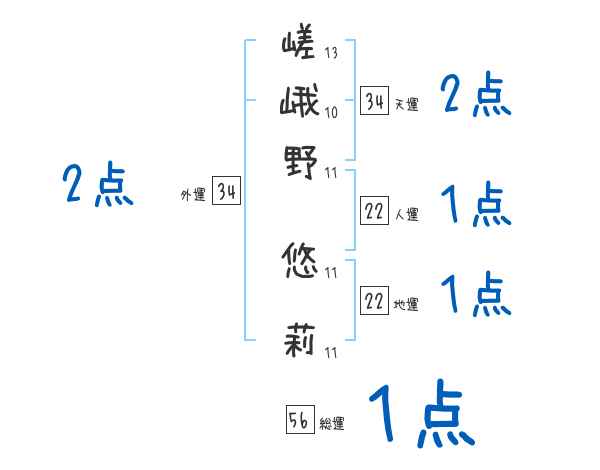人運![]() | 嵯峨野悠莉さんの人運は22画の1つ星!努力することが苦手ないっぽう手先が器用。芸術性にも優れる。 性格や才能などを表す2番目に重要な運勢です。人間関係や協調性、社会的な成功に影響します。主に20歳から50歳ぐらいまでの中年期の運勢を表します。 |