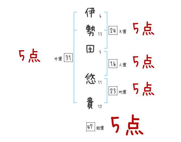 天運![]() | 伊勢田悠貴さんの天運は24画の5つ星!家庭運が良く順調な人生。金運にも恵まれる。 家系が持つ宿命的な運勢を表します。祖先から受け継いだ苗字ですので自分の力が及びません。家柄を象徴します。 |