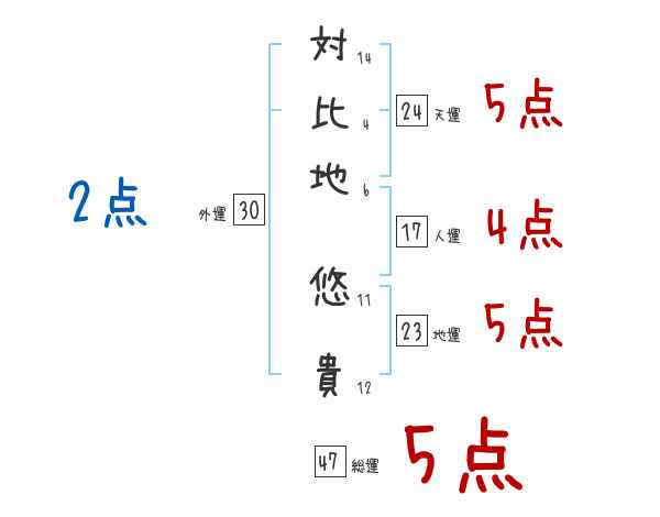 総運![]() | 対比地悠貴さんの総運は47画の5つ星!実力が開花し発展する円満な人生。財に恵まれる。 あなたの人生を表す1番重要な運勢です。生涯を通じて影響する総合運となり、主に50歳以降の晩年期に影響を及ぼします。 |