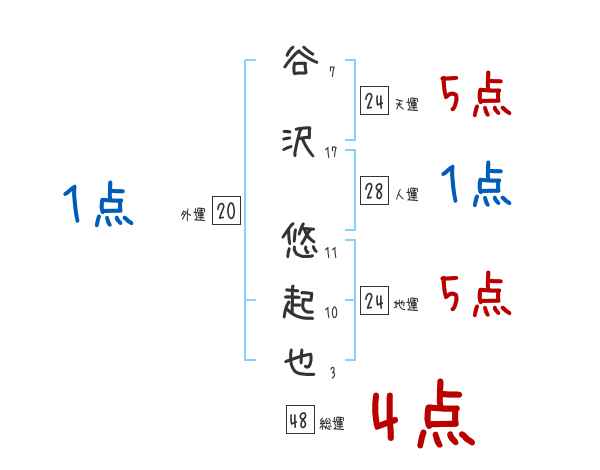 天運![]() | 谷沢悠起也さんの天運は24画の5つ星!家庭運が良く順調な人生。金運にも恵まれる。 家系が持つ宿命的な運勢を表します。祖先から受け継いだ苗字ですので自分の力が及びません。家柄を象徴します。 |