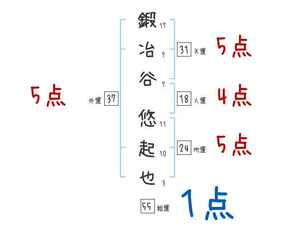 天運![]() | 鍛冶谷悠起也さんの天運は31画の5つ星!社交性があり判断力に優れる。順風満帆な人生で円満な生活。 家系が持つ宿命的な運勢を表します。祖先から受け継いだ苗字ですので自分の力が及びません。家柄を象徴します。 |