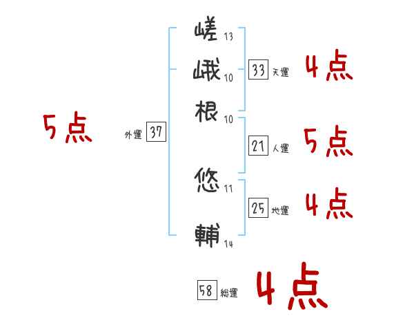 外運![]() | 嵯峨根悠輔さんの外運は37画の5つ星!努力家で順応性に優れる。現実的な考え方ができ忠実に物事をこなす。 生活面を象徴する運勢です。外部から受ける影響力を表し、結婚運、家庭運や職場、環境への順応性を表します。 |