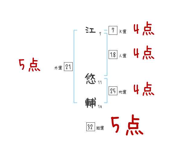 総運![]() | 江悠輔さんの総運は32画の5つ星!柔軟性があり成功する。チャンスが多く金運が良い。 あなたの人生を表す1番重要な運勢です。生涯を通じて影響する総合運となり、主に50歳以降の晩年期に影響を及ぼします。 |