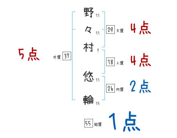天運![]() | 野々村悠輪さんの天運は29画の4つ星!完全主義で才能がある。厳格な心の持ち主。 家系が持つ宿命的な運勢を表します。祖先から受け継いだ苗字ですので自分の力が及びません。家柄を象徴します。 |