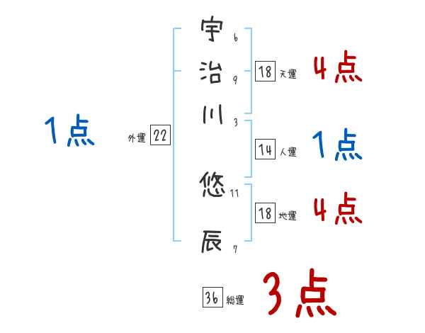 天運![]() | 宇治川悠辰さんの天運は18画の4つ星!情熱的で剛気。忍耐力があり信頼される。 家系が持つ宿命的な運勢を表します。祖先から受け継いだ苗字ですので自分の力が及びません。家柄を象徴します。 |