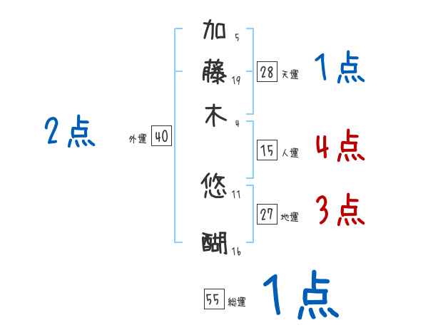 天運![]() | 加藤木悠醐さんの天運は28画の1つ星!家庭環境に注意。スポーツで活躍できる能力があるかも。 家系が持つ宿命的な運勢を表します。祖先から受け継いだ苗字ですので自分の力が及びません。家柄を象徴します。 |