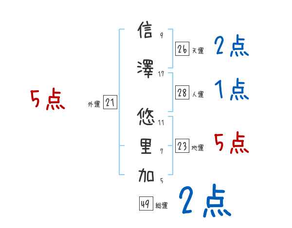 天運![]() | 信澤悠里加さんの天運は26画の2つ星!波瀾万丈かも。信頼できる人を大事にしましょう。 家系が持つ宿命的な運勢を表します。祖先から受け継いだ苗字ですので自分の力が及びません。家柄を象徴します。 |