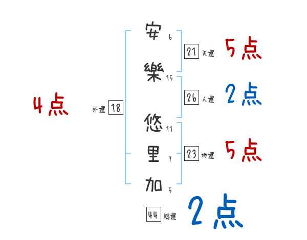総運![]() | 安樂悠里加さんの総運は44画の2つ星!誠実で慎重な性格。物事を考えすぎないように注意しましょう。 あなたの人生を表す1番重要な運勢です。生涯を通じて影響する総合運となり、主に50歳以降の晩年期に影響を及ぼします。 |
