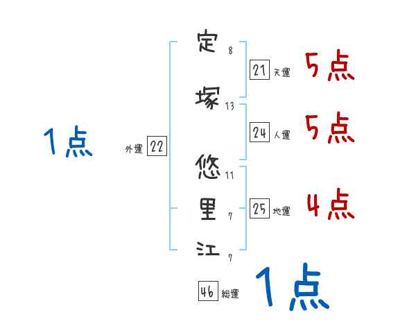 総運![]() | 定塚悠里江さんの総運は46画の1つ星!迷走することが多く苦労するかも。目先のことにとらわれないように。 あなたの人生を表す1番重要な運勢です。生涯を通じて影響する総合運となり、主に50歳以降の晩年期に影響を及ぼします。 |