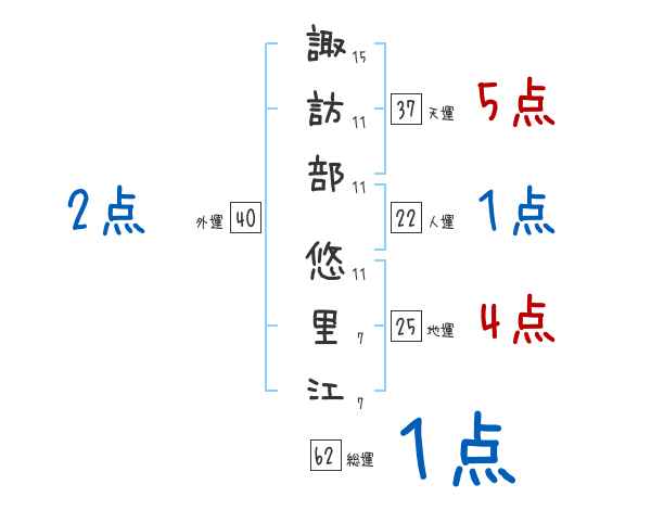 総運![]() | 諏訪部悠里江さんの総運は62画の1つ星!困難なトラブルが多く精神的に疲労しないように気をつけましょう。 あなたの人生を表す1番重要な運勢です。生涯を通じて影響する総合運となり、主に50歳以降の晩年期に影響を及ぼします。 |