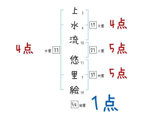 総運![]() | 上水流悠里絵さんの総運は54画の1つ星!トラブルが多いかも。周りをよく見て協調して過ごしましょう。 あなたの人生を表す1番重要な運勢です。生涯を通じて影響する総合運となり、主に50歳以降の晩年期に影響を及ぼします。 |