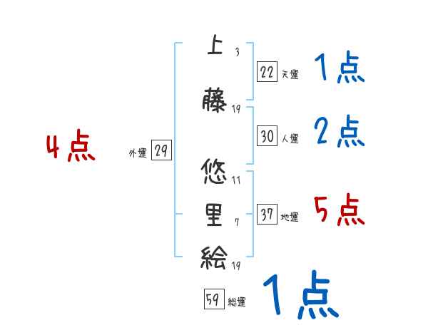 外運![]() | 上藤悠里絵さんの外運は29画の4つ星!完全主義で才能がある。厳格な心の持ち主。 生活面を象徴する運勢です。外部から受ける影響力を表し、結婚運、家庭運や職場、環境への順応性を表します。 |