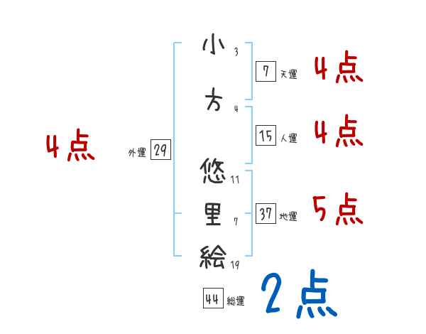 総運![]() | 小方悠里絵さんの総運は44画の2つ星!誠実で慎重な性格。物事を考えすぎないように注意しましょう。 あなたの人生を表す1番重要な運勢です。生涯を通じて影響する総合運となり、主に50歳以降の晩年期に影響を及ぼします。 |
