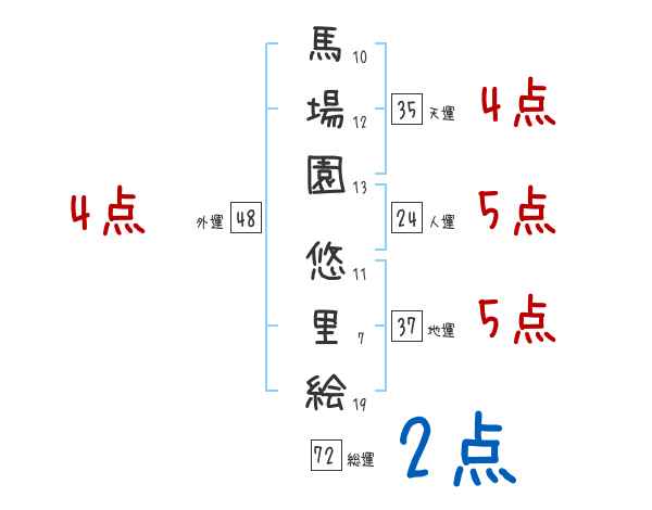 天運![]() | 馬場園悠里絵さんの天運は35画の4つ星!温厚な性格で感受性が高い。穏和な性格で人望が厚い。 家系が持つ宿命的な運勢を表します。祖先から受け継いだ苗字ですので自分の力が及びません。家柄を象徴します。 |