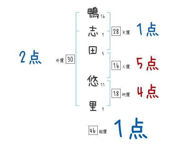 人運![]() | 鴨志田悠里さんの人運は16画の5つ星!人望が厚く大きく発展する。逆転成功が見える。 性格や才能などを表す2番目に重要な運勢です。人間関係や協調性、社会的な成功に影響します。主に20歳から50歳ぐらいまでの中年期の運勢を表します。 |
