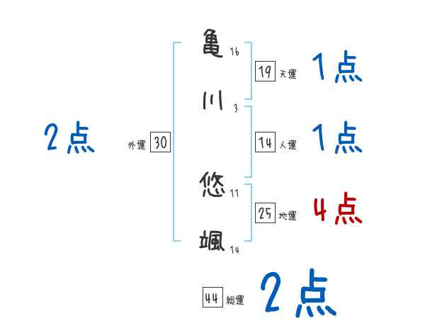 総運![]() | 亀川悠颯さんの総運は44画の2つ星!誠実で慎重な性格。物事を考えすぎないように注意しましょう。 あなたの人生を表す1番重要な運勢です。生涯を通じて影響する総合運となり、主に50歳以降の晩年期に影響を及ぼします。 |