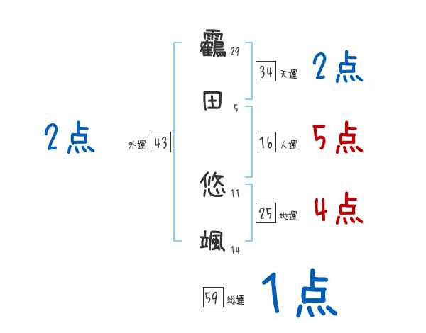 天運![]() | 靏田悠颯さんの天運は34画の2つ星!独創性に優れるが、自尊心が強く災難に注意しましょう。 家系が持つ宿命的な運勢を表します。祖先から受け継いだ苗字ですので自分の力が及びません。家柄を象徴します。 |