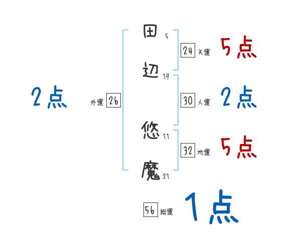 天運![]() | 田辺悠魔さんの天運は24画の5つ星!家庭運が良く順調な人生。金運にも恵まれる。 家系が持つ宿命的な運勢を表します。祖先から受け継いだ苗字ですので自分の力が及びません。家柄を象徴します。 |