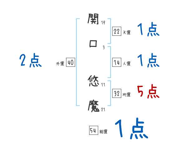 天運![]() | 関口悠魔さんの天運は22画の1つ星!努力することが苦手ないっぽう手先が器用。芸術性にも優れる。 家系が持つ宿命的な運勢を表します。祖先から受け継いだ苗字ですので自分の力が及びません。家柄を象徴します。 |