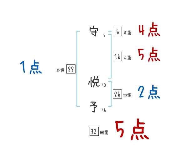 天運![]() | 守悦予さんの天運は6画の4つ星!慎重な努力家で信頼を得る。誠実な精神で向上心に優れる。 家系が持つ宿命的な運勢を表します。祖先から受け継いだ苗字ですので自分の力が及びません。家柄を象徴します。 |