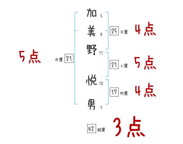 天運![]() | 加美野悦男さんの天運は25画の4つ星!個性があり才能があふれる。強運の持ち主で発展する。 家系が持つ宿命的な運勢を表します。祖先から受け継いだ苗字ですので自分の力が及びません。家柄を象徴します。 |