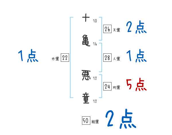 天運![]() | 十亀悪童さんの天運は26画の2つ星!波瀾万丈かも。信頼できる人を大事にしましょう。 家系が持つ宿命的な運勢を表します。祖先から受け継いだ苗字ですので自分の力が及びません。家柄を象徴します。 |