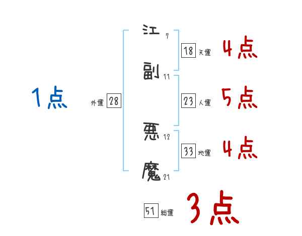 天運![]() | 江副悪魔さんの天運は18画の4つ星!情熱的で剛気。忍耐力があり信頼される。 家系が持つ宿命的な運勢を表します。祖先から受け継いだ苗字ですので自分の力が及びません。家柄を象徴します。 |