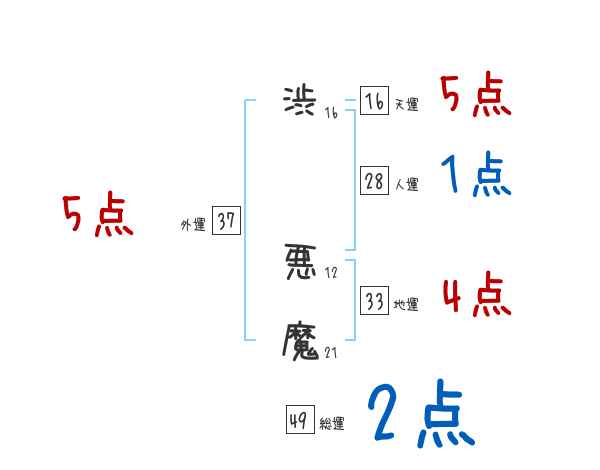 天運![]() | 渋悪魔さんの天運は16画の5つ星!人望が厚く大きく発展する。逆転成功が見える。 家系が持つ宿命的な運勢を表します。祖先から受け継いだ苗字ですので自分の力が及びません。家柄を象徴します。 |