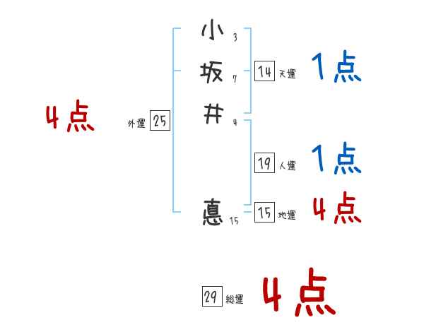 総運![]() | 小坂井悳さんの総運は29画の4つ星!完全主義で才能がある。厳格な心の持ち主。 あなたの人生を表す1番重要な運勢です。生涯を通じて影響する総合運となり、主に50歳以降の晩年期に影響を及ぼします。 |
