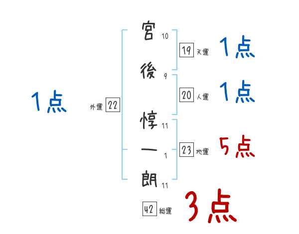 外運![]() | 宮後惇一朗さんの外運は22画の1つ星!努力することが苦手ないっぽう手先が器用。芸術性にも優れる。 生活面を象徴する運勢です。外部から受ける影響力を表し、結婚運、家庭運や職場、環境への順応性を表します。 |