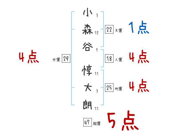 総運![]() | 小森谷惇大朗さんの総運は47画の5つ星!実力が開花し発展する円満な人生。財に恵まれる。 あなたの人生を表す1番重要な運勢です。生涯を通じて影響する総合運となり、主に50歳以降の晩年期に影響を及ぼします。 |